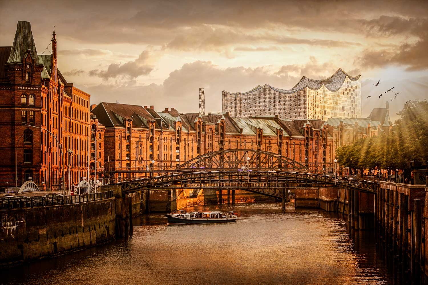 Wir treffen uns kurz vor Sonnenuntergang und fangen als Einstimmung auf unseren Rundgang die besondere Lichtstimmung ein, in die die Speicherstadt von schräg einfallenden Sonnenstrahlen getaucht wird. Nach Sonnenuntergang beginnt die »Blaue Stunde« in der das Fotografieren noch anspruchsvoller wird. Ich erkläre alle nötigen Kameraeinstellungen, wie manueller ISO-Wert, Blenden- und Zeiteinstellung, sowie Weißabgleich. Die HafenCity und Speicherstadt mit ihren schönen Kulissen sind als kleine fotografische Herausforderungen gedacht, die Dich zu interessanteren Bildergebnissen verhelfen werden.